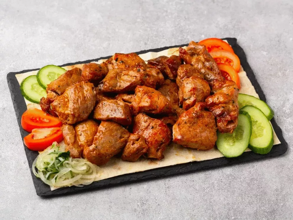 В комплекте — порция шашлыка, ароматный маринованный лук и свежая зелень.